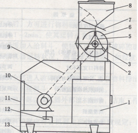 8-進料斗;9-三角帶;10-電動機;11-底座;12-調(diào)節(jié)螺桿;13-底座;